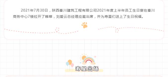 2021年7月30日,陜西秦川建筑工程有限公司2021年度上半年員工生日宴在秦川商務中心7樓拉開了帷幕。